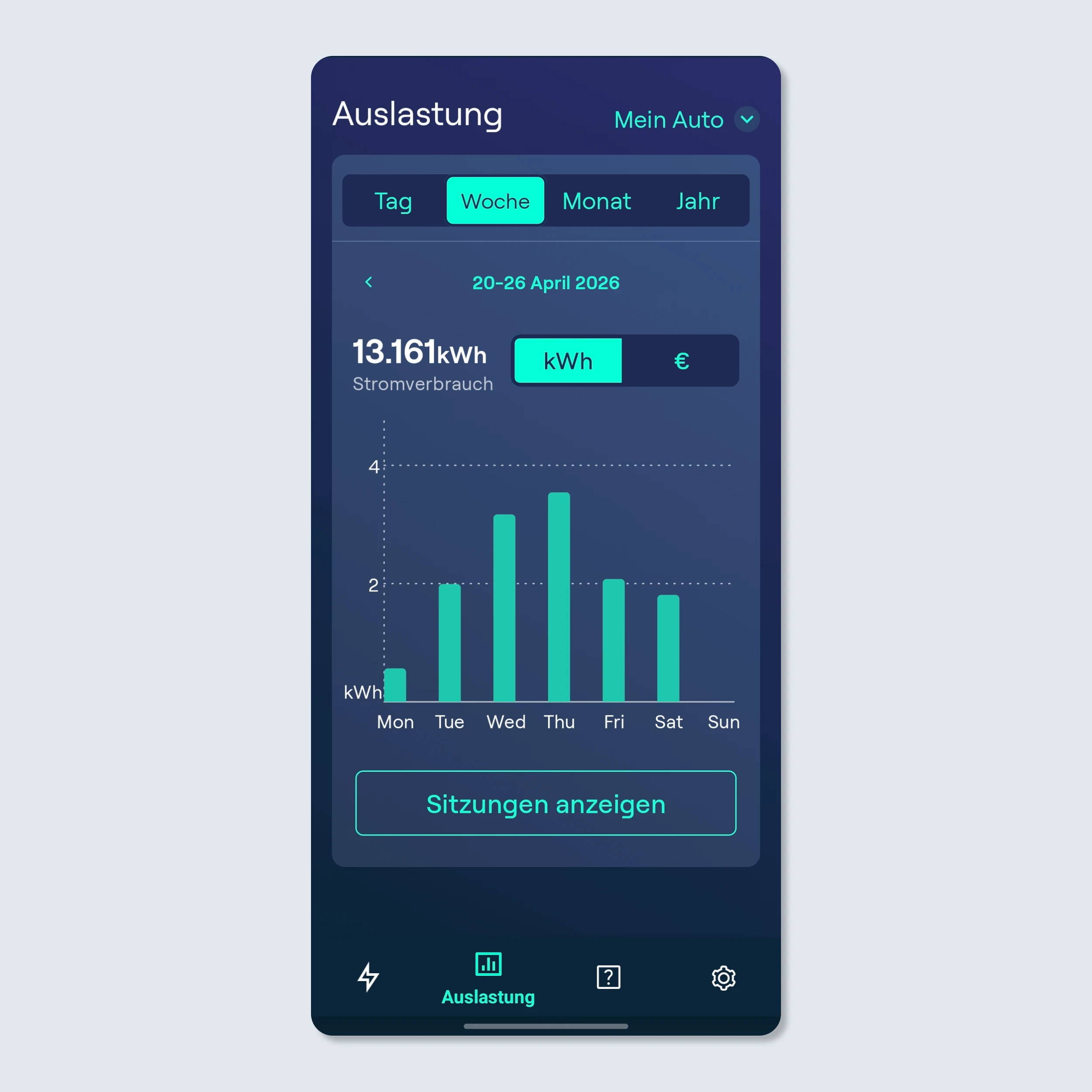- Oben auf dem Bildschirm kannst du zwischen der Tages-, Wochen-, Monats- und Jahresansicht wählen. Wähle anschließend den gewünschten Zeitraum aus, für den du deine Ladesitzungen sehen möchtest.