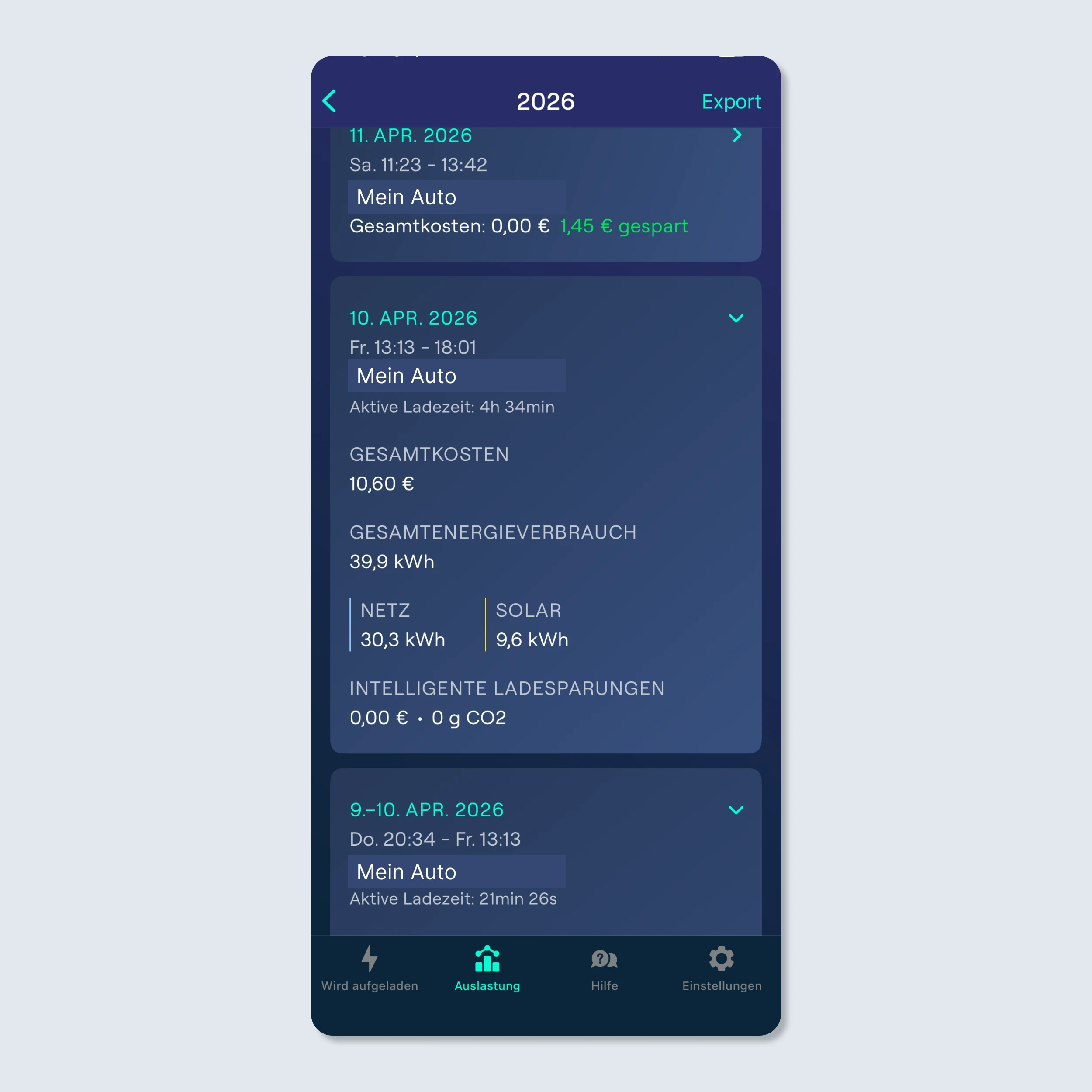 - Alle Ladesitzungen des gewählten Zeitraums werden als Liste angezeigt.