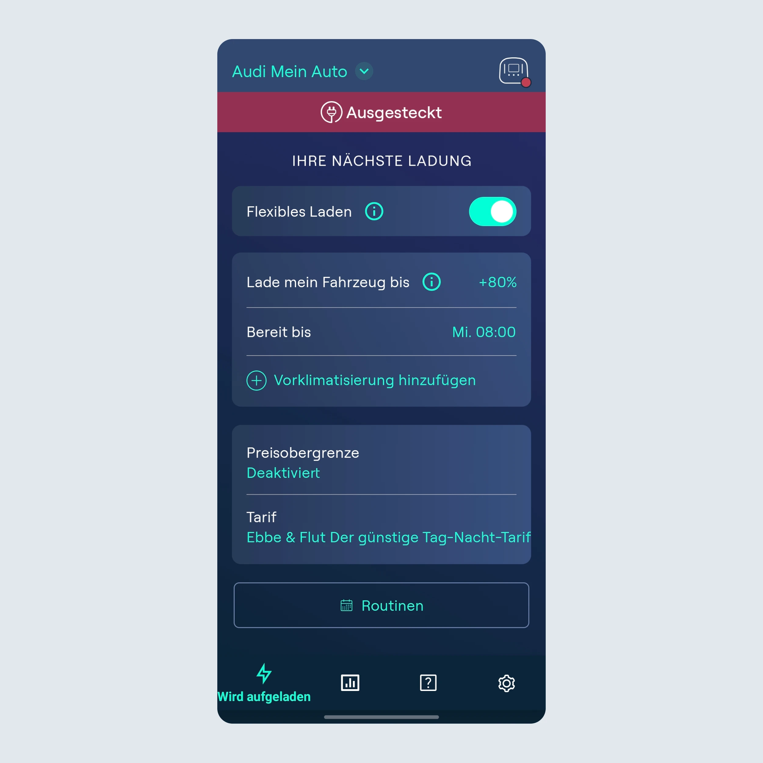 Du kannst diese Einstellungen bei jedem Einstecken gleich lassen oder sie je nach gewünschter Lademenge und benötigter Bereitschaftszeit für jede Sitzung anpassen. Die Lademenge und die ‘Bereit bis’-Zeit können sowohl vor dem Einstecken als auch während einer Sitzung über die Ladeseite geändert werden.