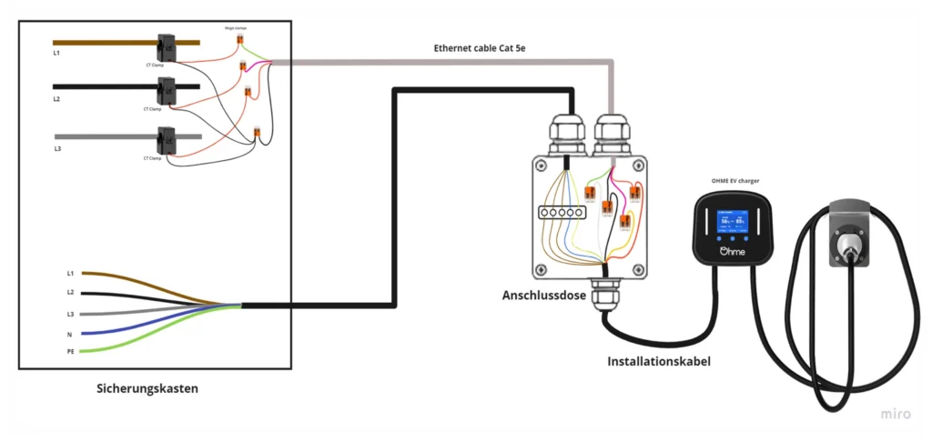 Bei einer Dreiphasen-Installation misst jede CT-Klemme den Stromfluss einer einzelnen Phase. So kann der Ohme Home Pro die gesamte Hauslast überwachen und die Ladeleistung bei Bedarf dynamisch anpassen – die sogenannte Lastverteilung. Damit wird verhindert, dass die Gesamtlast im Haus den zulässigen Maximalwert überschreitet.