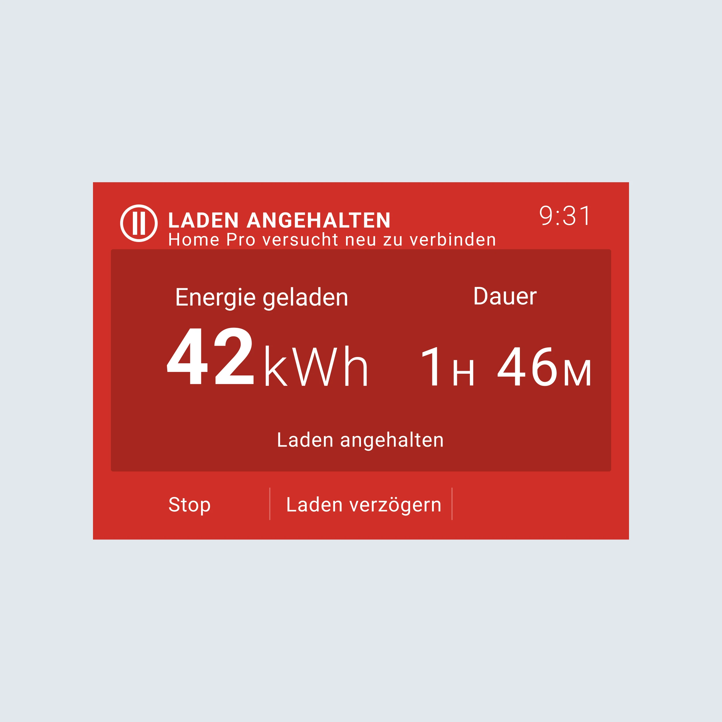 Wenn der Ladevorgang pausiert ist, siehst du oben links „Laden pausiert” und unter den Sitzungsstatistiken „Laden gestoppt”. Wenn du den Start des Ladevorgangs verzögern möchtest, tippe auf „Laden verzögern”.