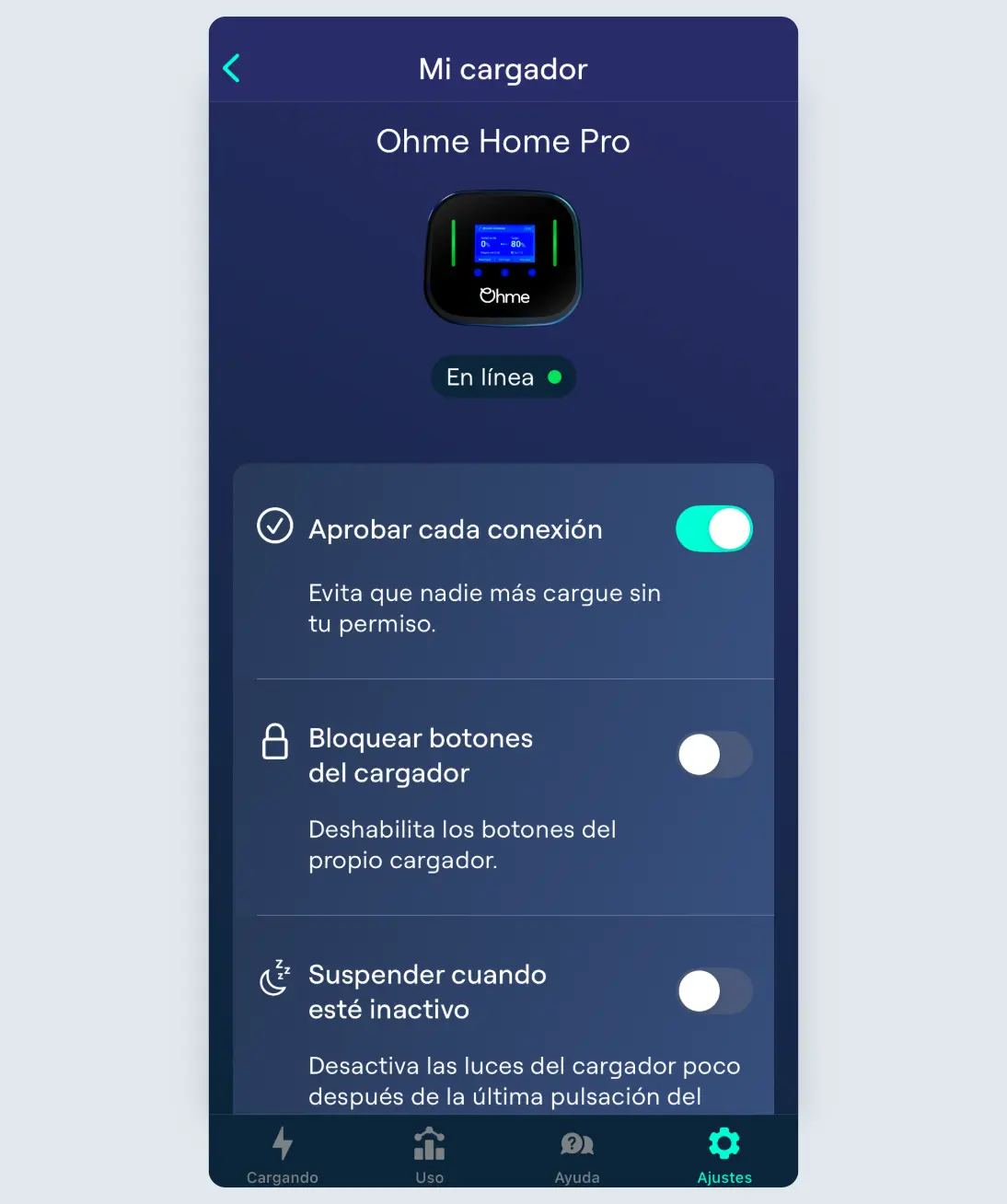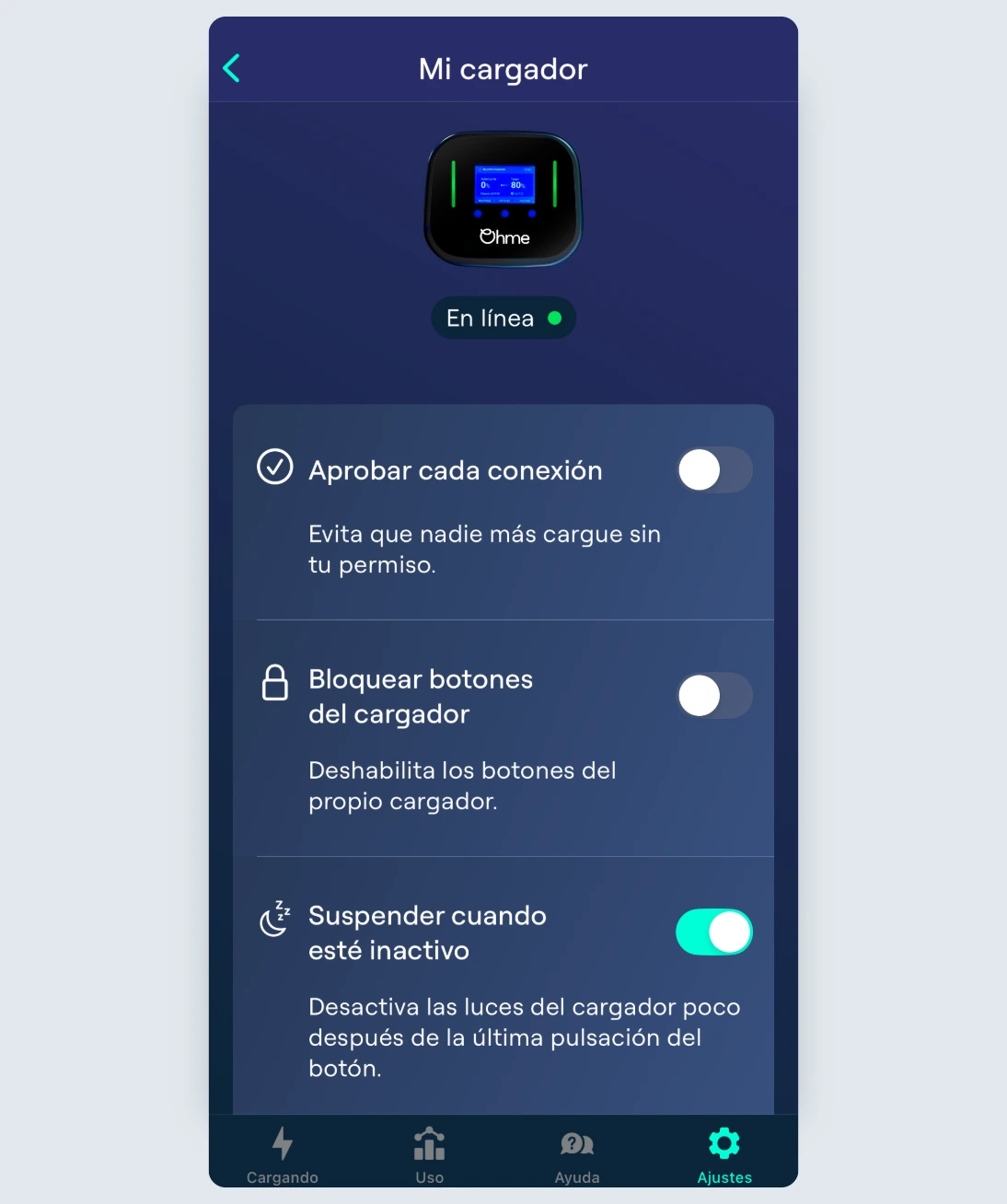 En la sección “Mi cargador” de la app de Ohme, encontrarás tres funciones que puedes activar para ayudar a mantener tu cargador Ohme seguro. Puedes acceder a esta página desde la pantalla de Ajustes tocando “Mi cargador”.