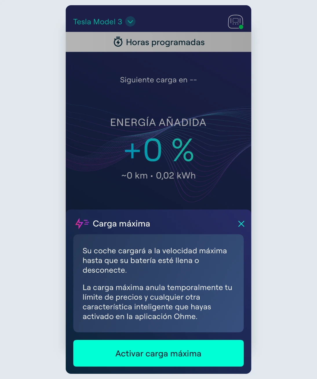 Para anular la carga inteligente y cargar de inmediato, toca “Carga máxima”.