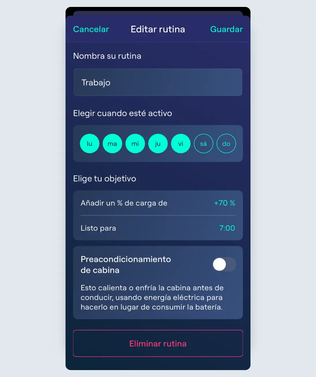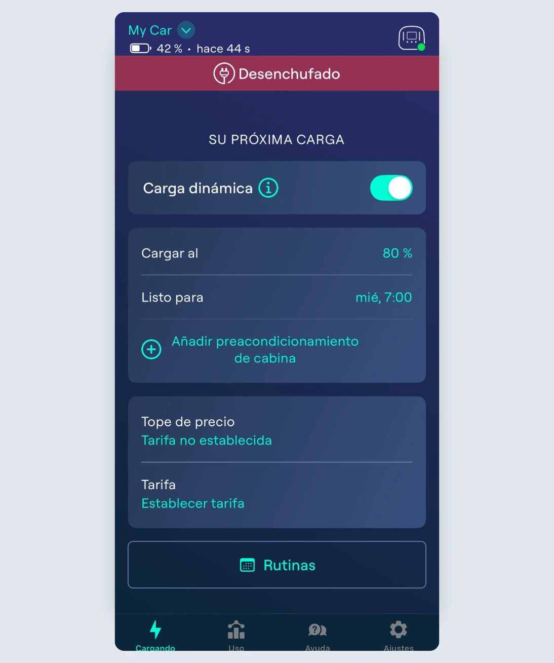 Las Rutinas son programas de carga que puedes configurar para horas o días específicos a lo largo de la semana. Puedes configurarlas desde el botón “Rutinas” en la parte inferior de la página de Carga. Nota: para ver las Rutinas, debes tener activada la carga dinámica.