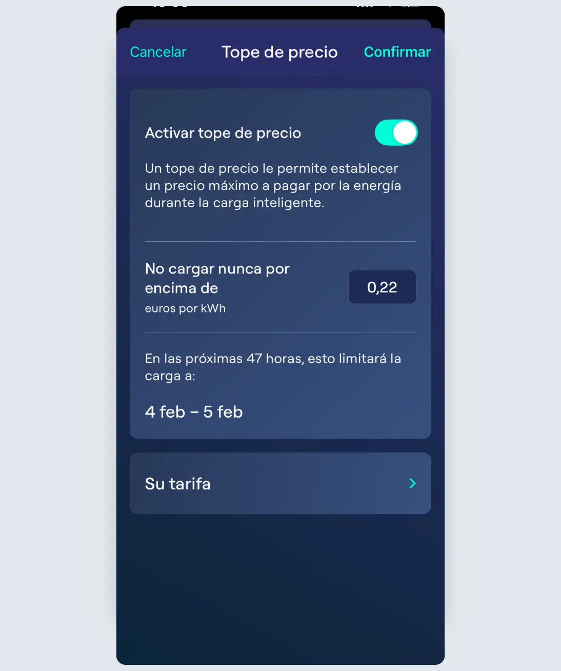 Ohme establecerá automáticamente el límite de precio en función de la tarifa valle del plan indicado. Sin embargo, si deseas modificarlo, solo tienes que tocar el precio y ajustarlo según tus necesidades.