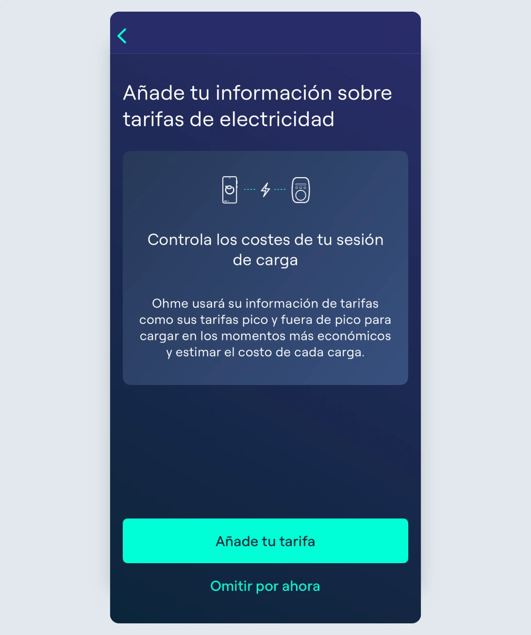 A continuación, se te pedirá que introduzcas la información de tu tarifa. Ohme utiliza estos datos para estimar el coste de tus sesiones de carga y te permitirá programar la carga según las horas más económicas de tu tarifa. Para empezar, toca Añade tu tarifa.