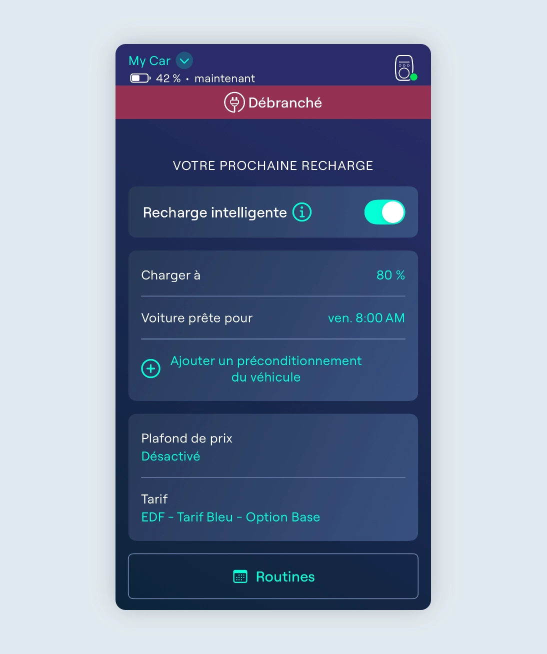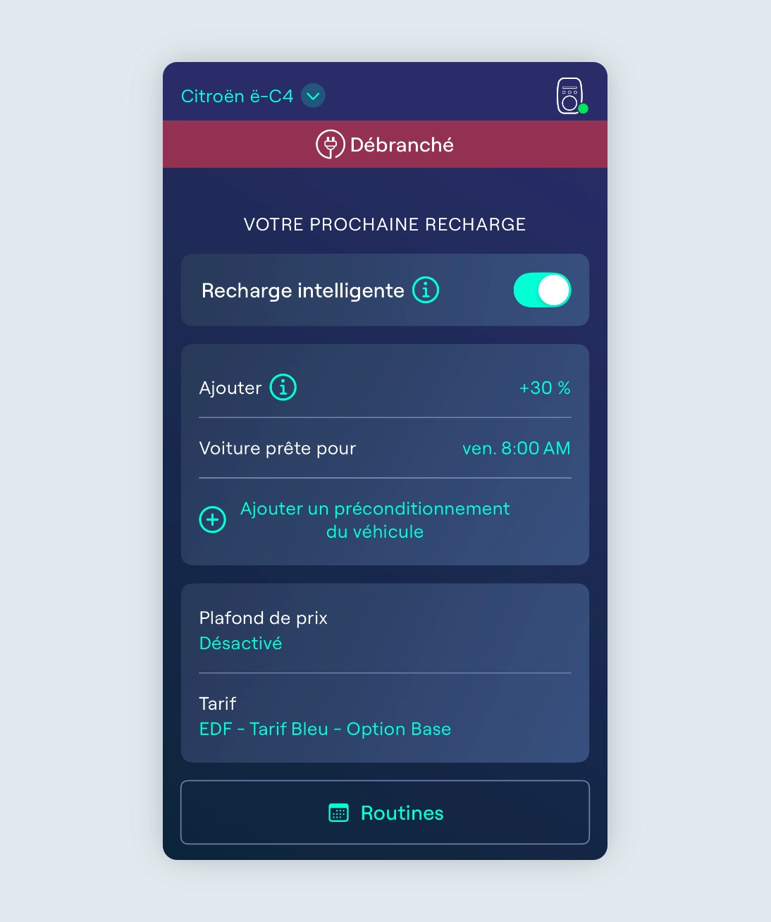 Vous pouvez personnaliser vos paramètres de recharge directement depuis la page Recharge, ou via les Routines, selon vos besoins de conduite.