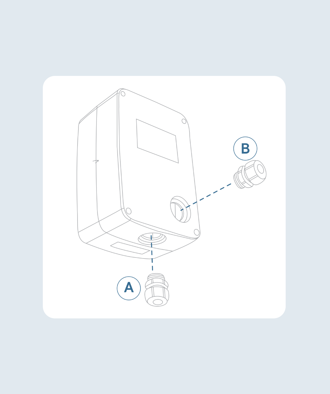 L’ePod S possède deux points d’entrée de câble d’entrée, A ou B. Choisissez l’option d’installation qui convient le mieux aux besoins du client. Vous pouvez utiliser le presse-étoupe M25 ou l’œillet en caoutchouc fourni dans la boîte pour fixer le câble d’alimentation, en fonction de la taille du câble et des préférences d’installation.