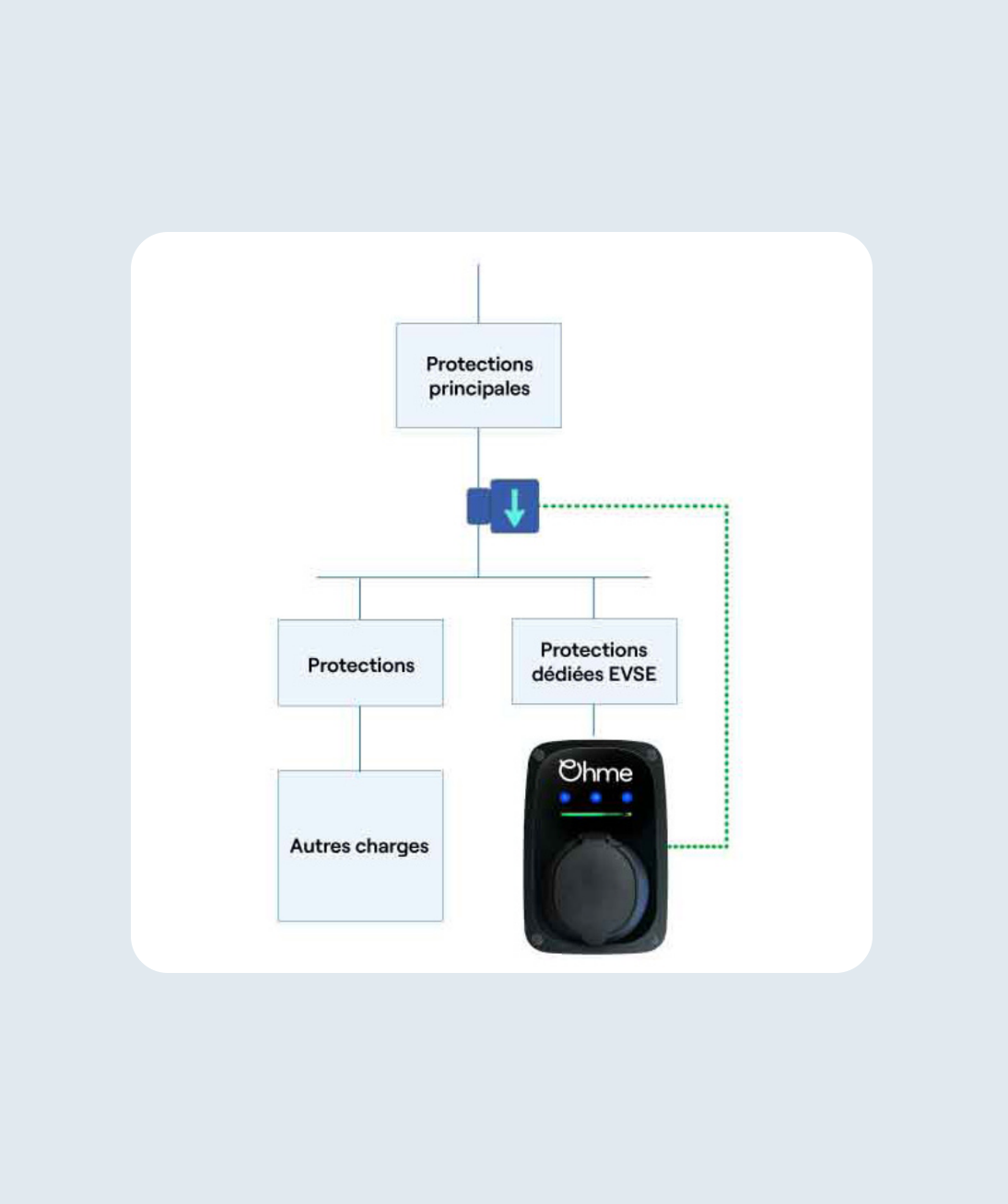 Important : L’installation doit être réalisée par un électricien qualifié et conforme à la réglementation française en vigueur, notamment la norme NF C 15-100 et les normes applicables à la recharge des véhicules électriques.