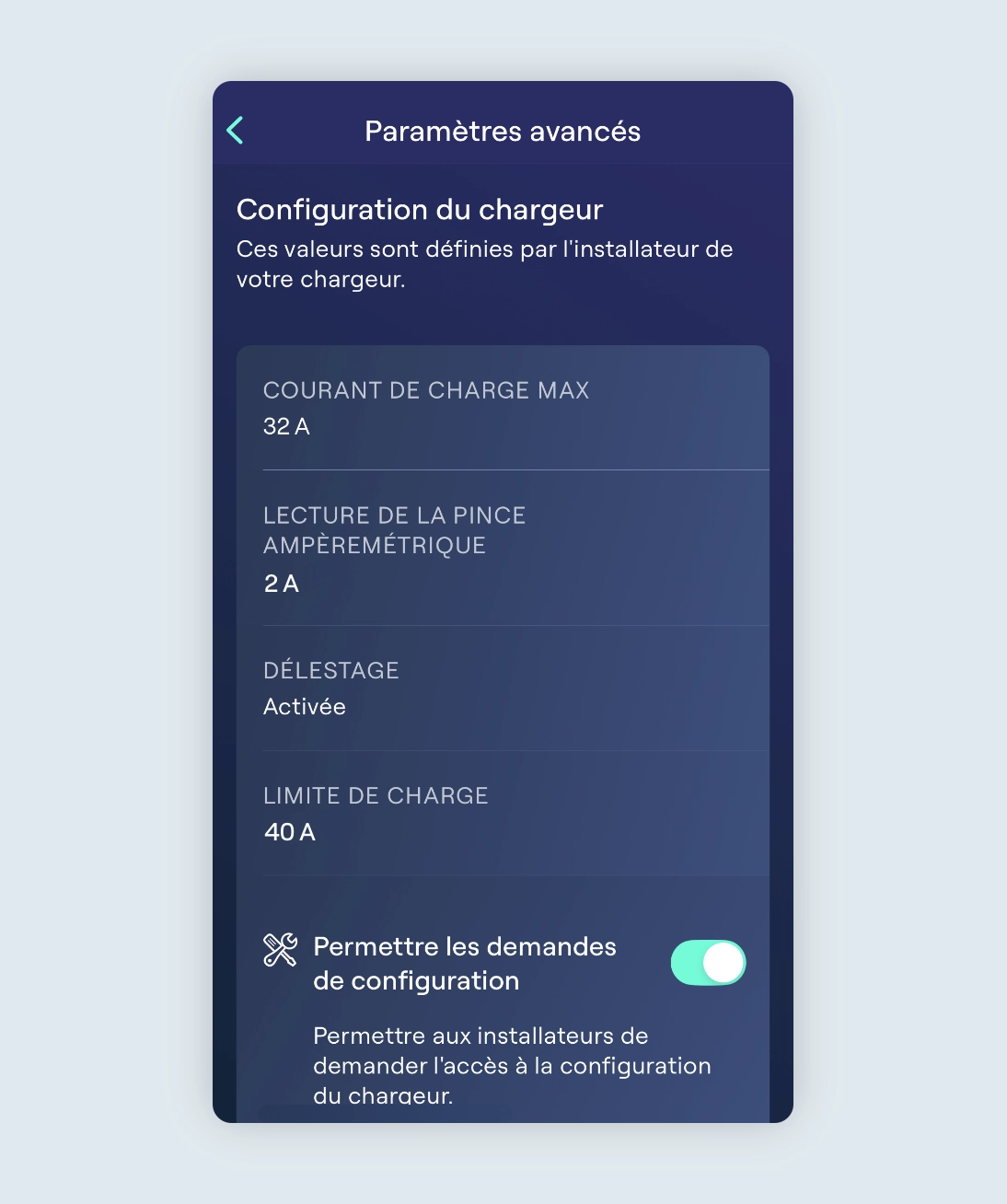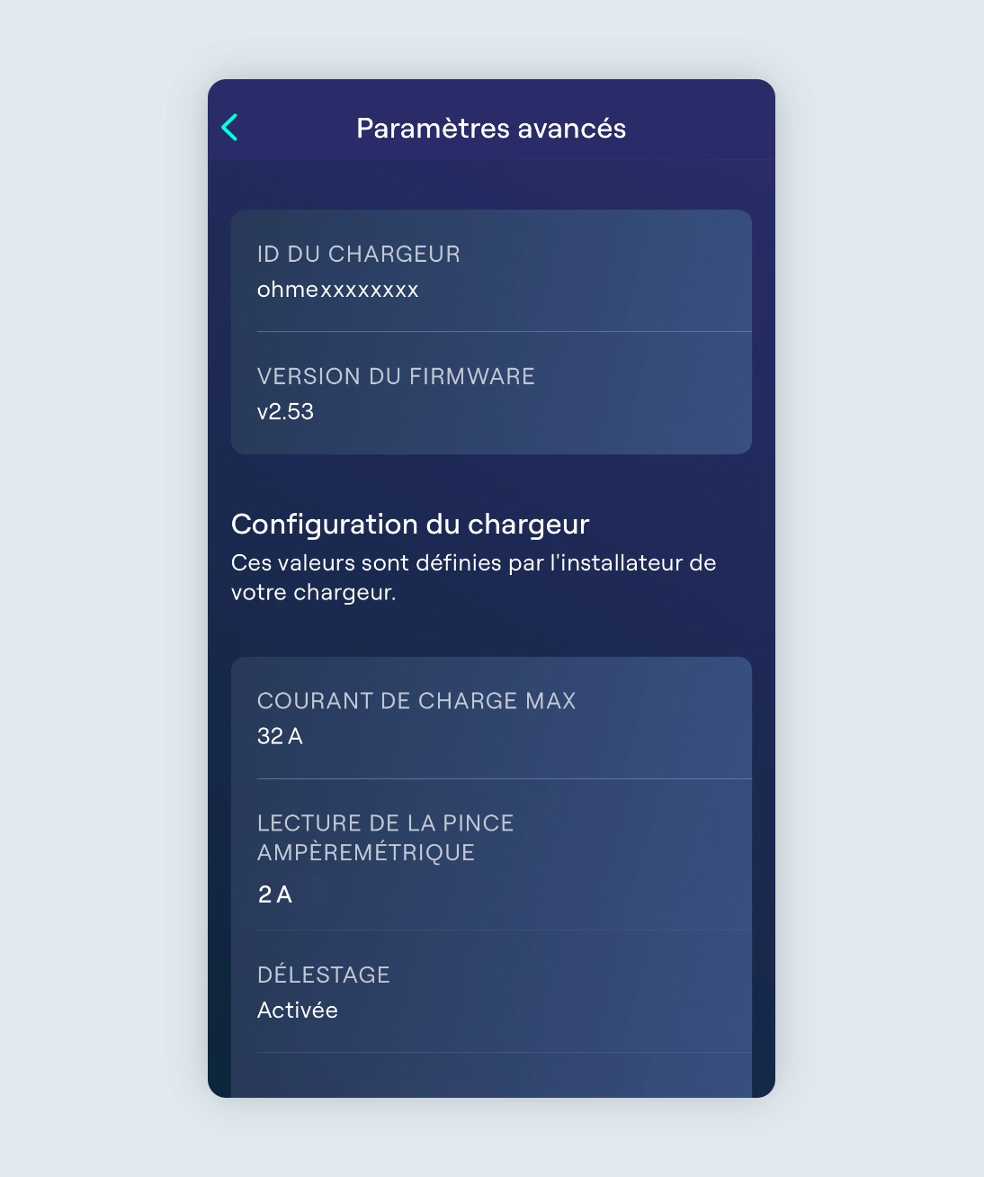 Dans certains cas, pour des raisons de sécurité, votre installateur peut régler le taux de charge maximal de votre Ohme à une vitesse inférieure à la vitesse habituelle de 32 ampères.