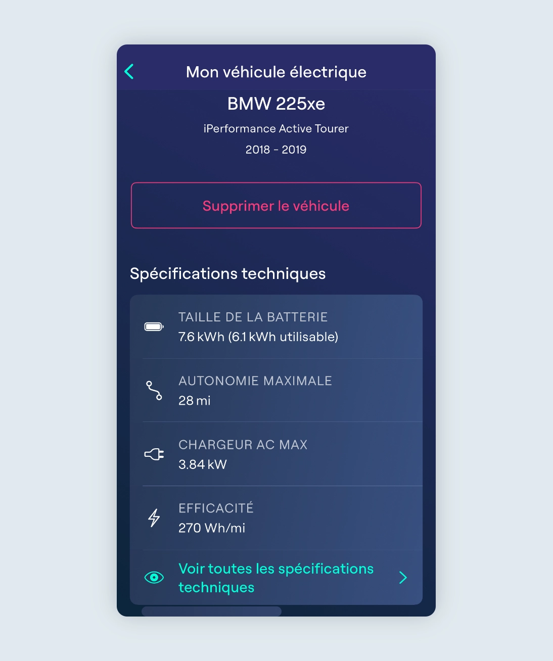 Pour ce faire, appuyez sur Paramètres > Mon véhicule électrique et faites défiler vers le bas pour afficher les « Spécifications techniques », en particulier la vitesse « Charge CA maximale ». Si vous devez changer de voiture, appuyez simplement sur « Changer de véhicule électrique » en haut de la page. Vous pouvez toujours créer un profil de véhicule personnalisé si nécessaire.
