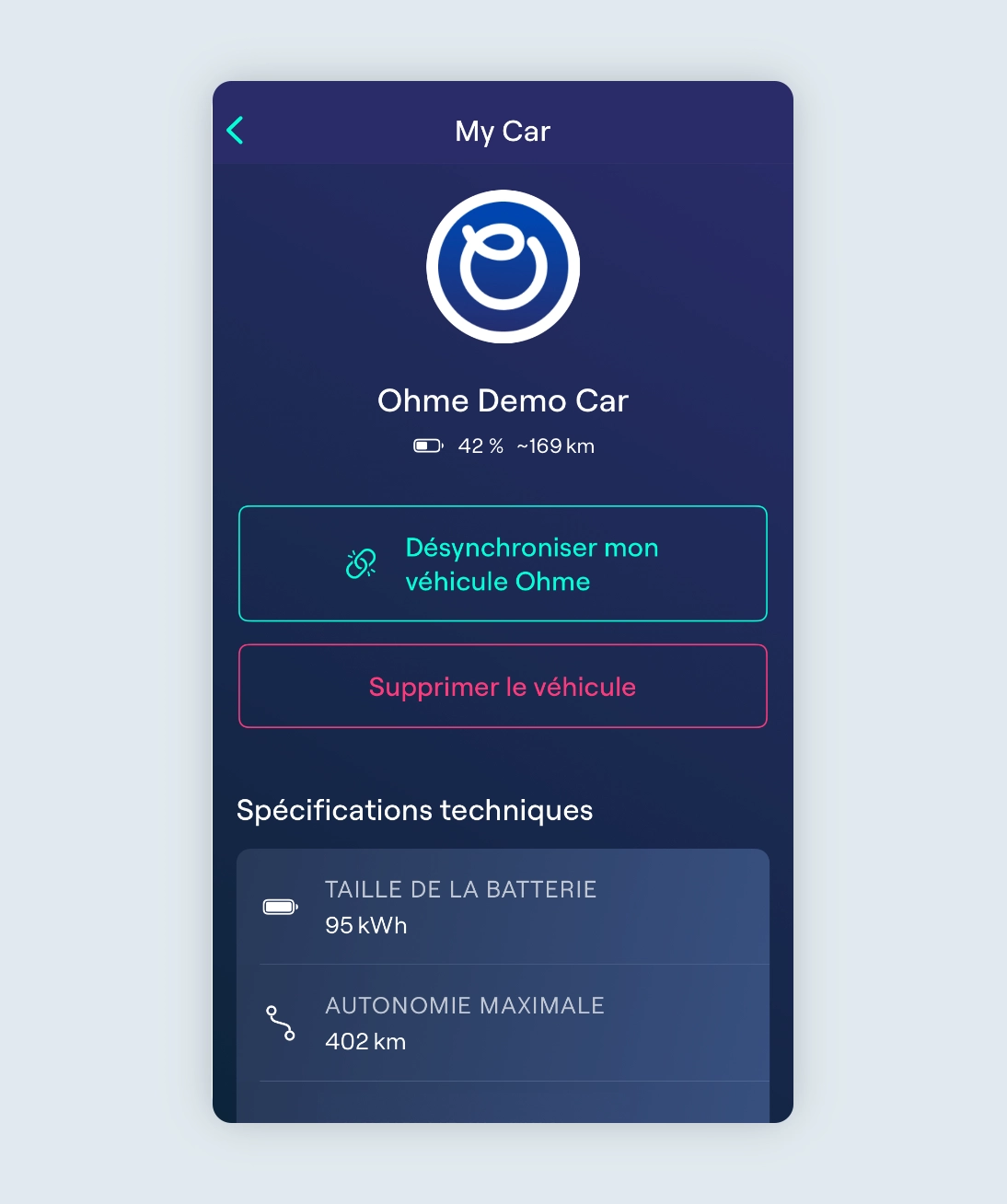 Il peut arriver qu’Ohme ne puisse pas récupérer le niveau de batterie à cause d’un problème de connexion. Une connexion instable peut entraîner un affichage différent des données entre votre véhicule, l’application constructeur et l’application Ohme.