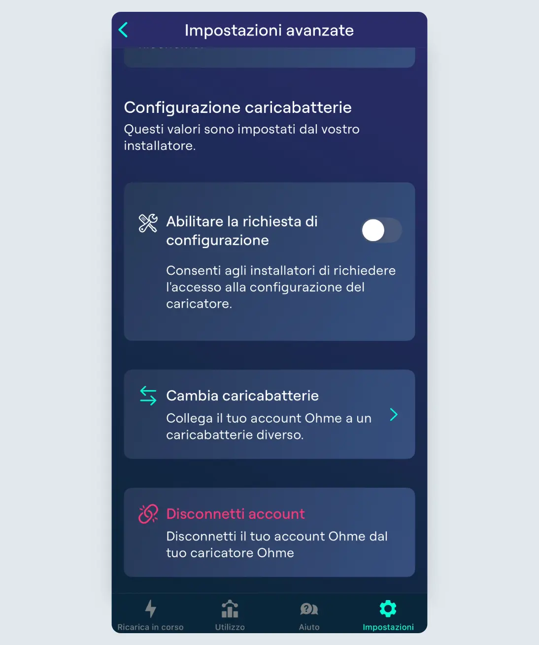 Puoi trovare questa opzione in Impostazioni > Il mio caricatore > Impostazioni avanzate.