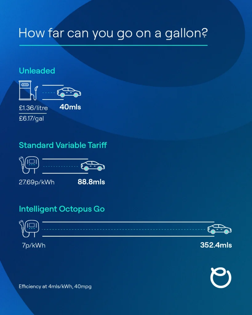 With the current price of petrol at around £6.17 per gallon (£1.36 per litre), a typical petrol car would travel around 40 miles on one gallon of fuel. However, the same amount spent charging an EV with Ohme on a smart energy tariff could see your car travel more than 350 miles!